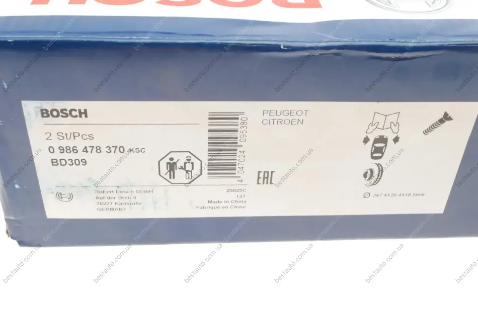 Диск тормозной (передний) Peugeot 206 1.4/1.6 98-12 (247.4x20.4) BOSCH 0 986 478 370