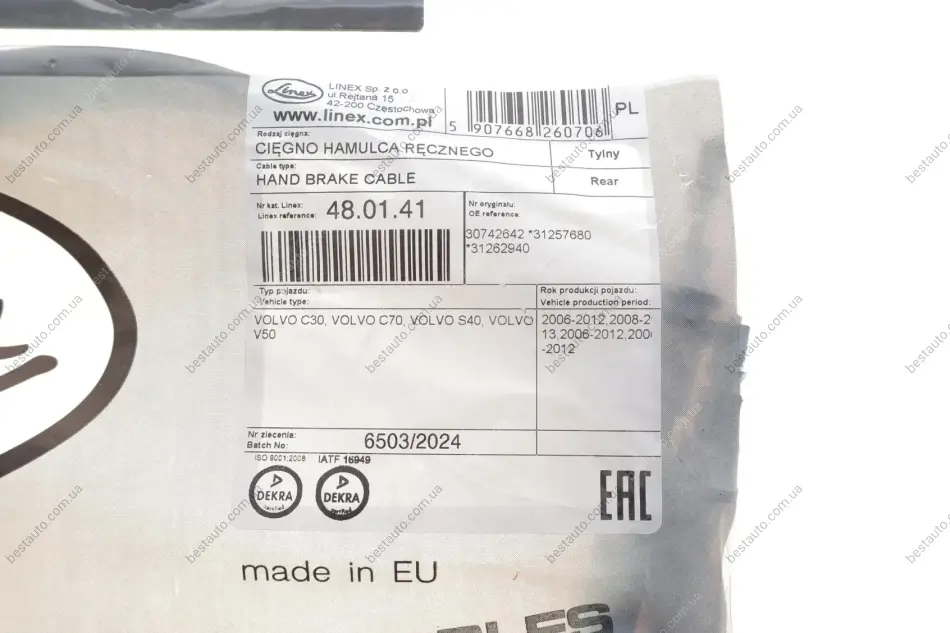 Трос ручника (задний) Volvo C30/C70/S40/V50 03-13 (1816/1860mm)